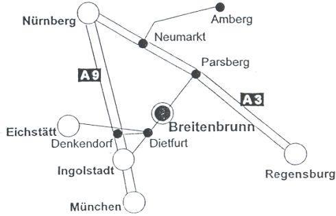 Über A9 / Ausfahrt Denkendorf, dann Richtung Beilngries, nach circa 3km rechts Richtung Dietfurt. In Dietfurt der Beschilderung nach Breitenbrunn folgen. |